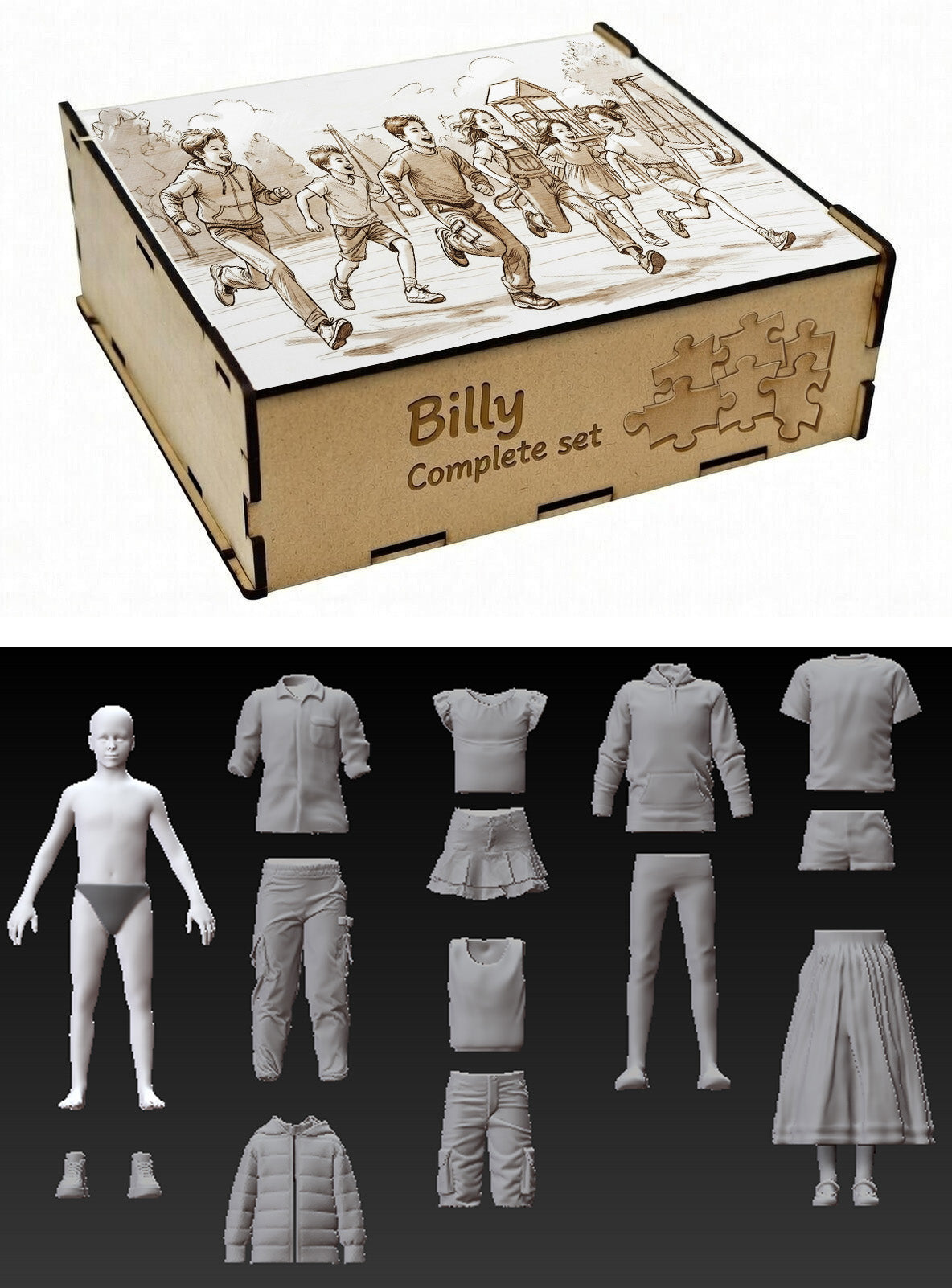 By mixing and matching these pieces, decorators can assemble a wide variety of fully dressed child characters, each with their own look and personality.