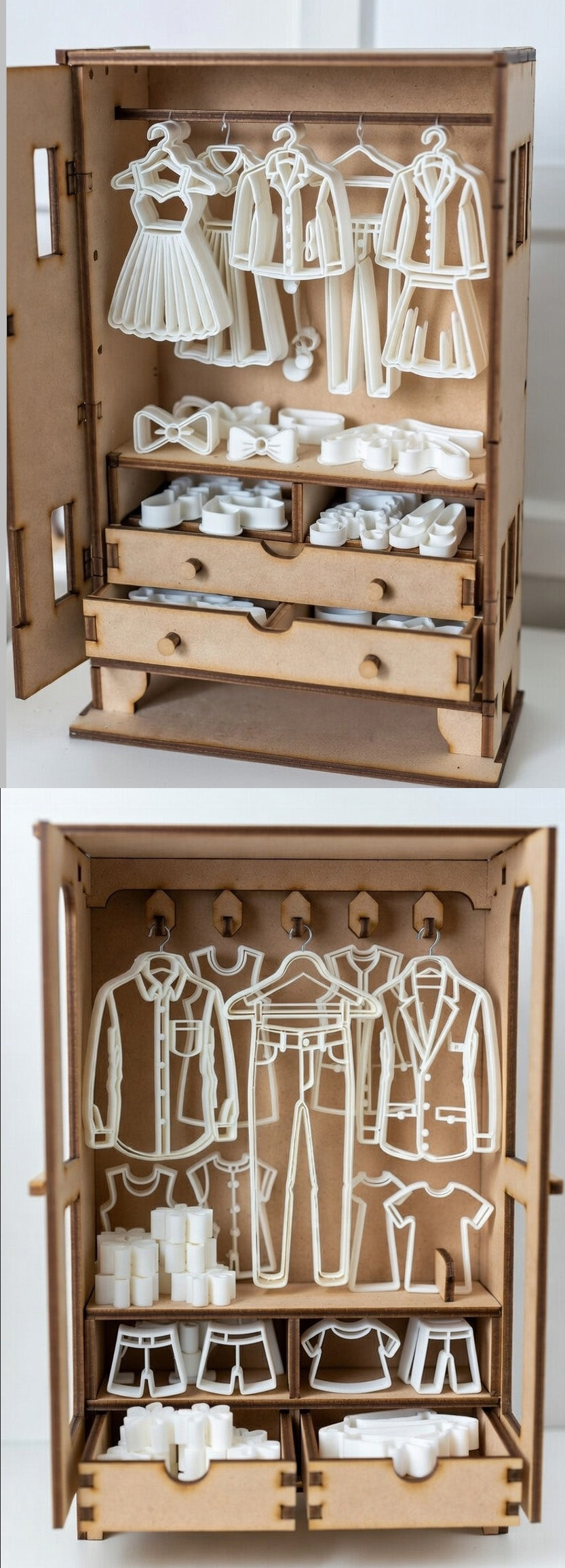 The aim is to design storage containers styled like miniature wardrobes, paired with cookie cutters that cut perfectly sized clothing patterns for Bella and Beau. Each cutter will produce clothing pieces that fit the figures properly, making it easier to create consistent, well-fitting outfits.