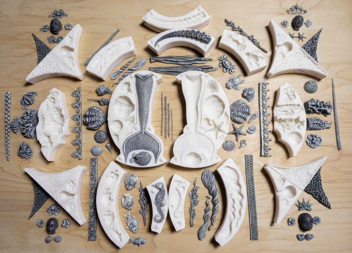 Shells, sea plants, coral clusters, and sea creature molds, including a fish, a crab, a turtle, a seahorse, and an octopus tentacle.